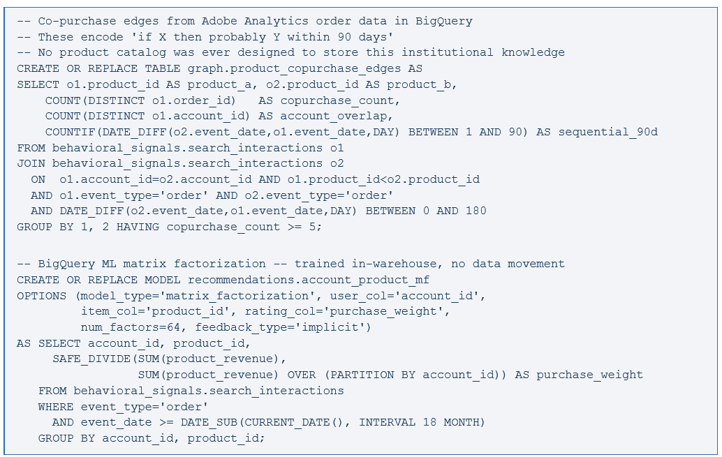 The technology described here is real and deployed, and well-supported by GCP. The discipline to operate it — to maintain the data contracts, to run properly powered A/B tests against conversion metrics, to retrain on schedule rather than when someone complains — that is the compounding advantage. The companies that have built it right are genuinely hard to displace. Not because of the model. Because of the years of behavioral signal in BigQuery, the fine-tuned embeddings, the procurement graph. You cannot copy that stack. Start with the Adobe Analytics pipeline. Everything else follows.