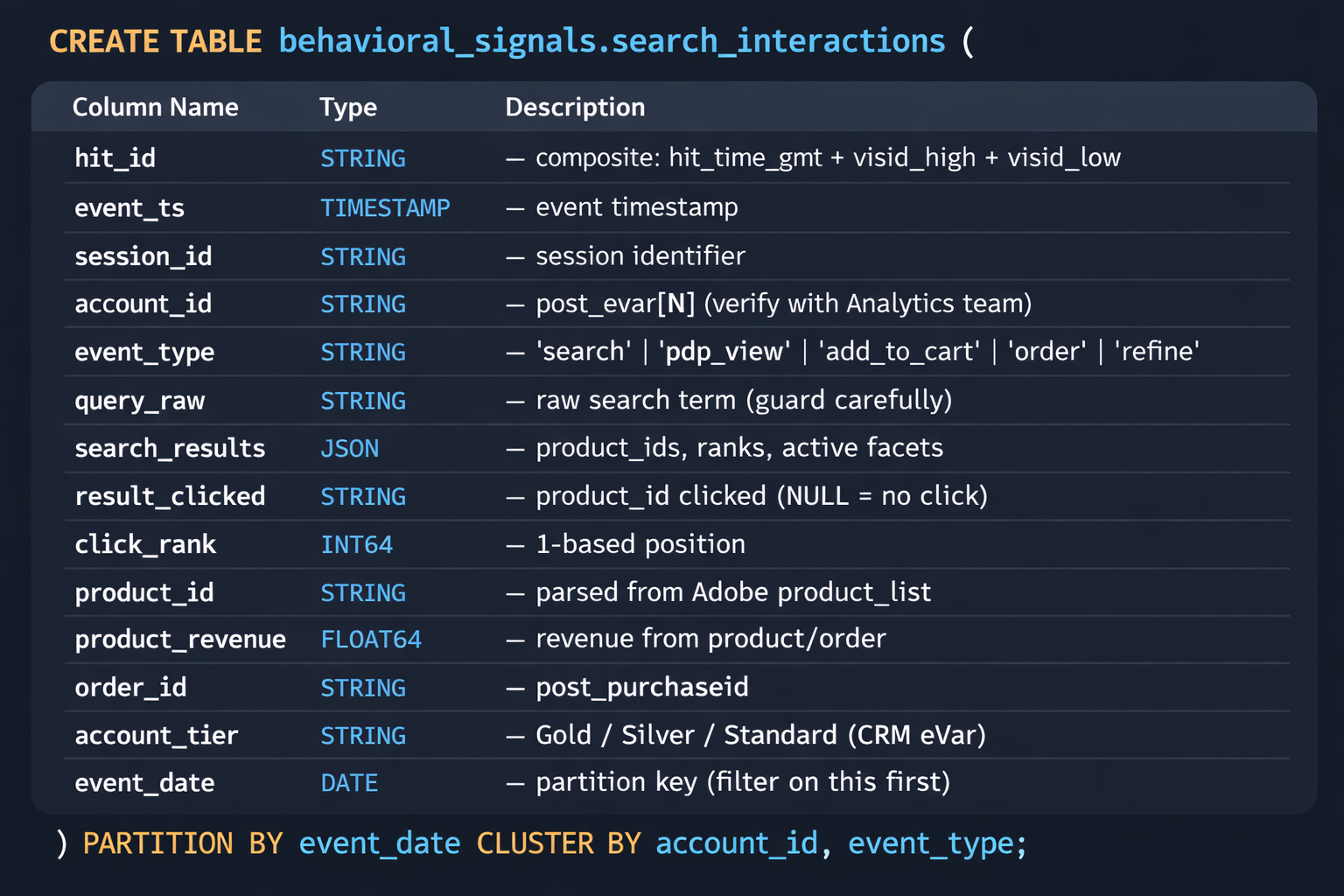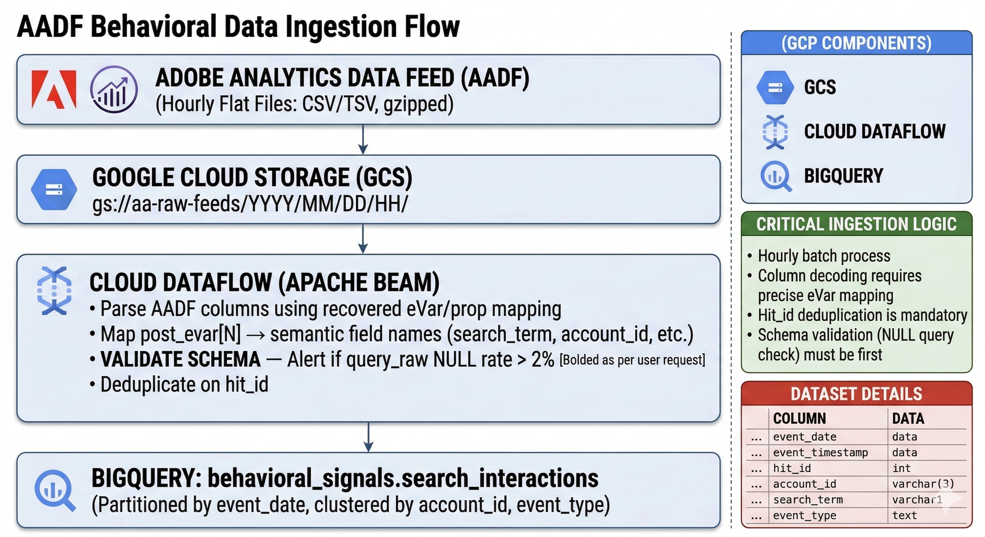 The schema validation step in Dataflow is not optional. Add it on day one. Here is why: we did not add it on day one. About eight weeks into production, the Analytics team reassigned the eVar that carried our search term to a new campaign variable. The Dataflow pipeline kept running, writing NULL into query_raw without complaint. We discovered it when the triplet mining query returned 40% NULLs. We had been training on garbage for nearly two months and the model metrics showed nothing obviously wrong until they did — all at once.