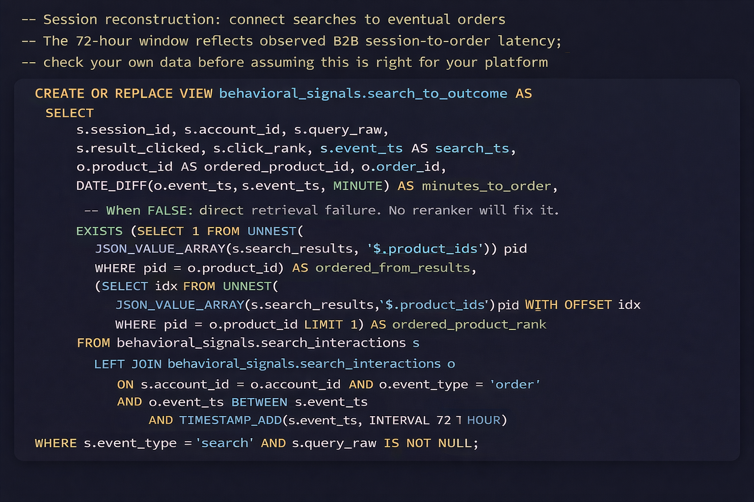 Build the session reconstruction view next. Run it on your existing Adobe Analytics data before you do anything else. Look at the ordered_from_results field. If more than 15% of your converted sessions show FALSE, you have a retrieval problem. No reranker fixes a retrieval failure. Ours was 22% when we first ran it. Uncomfortable to show to leadership. Also the number that unlocked the investment to fix the retrieval layer.