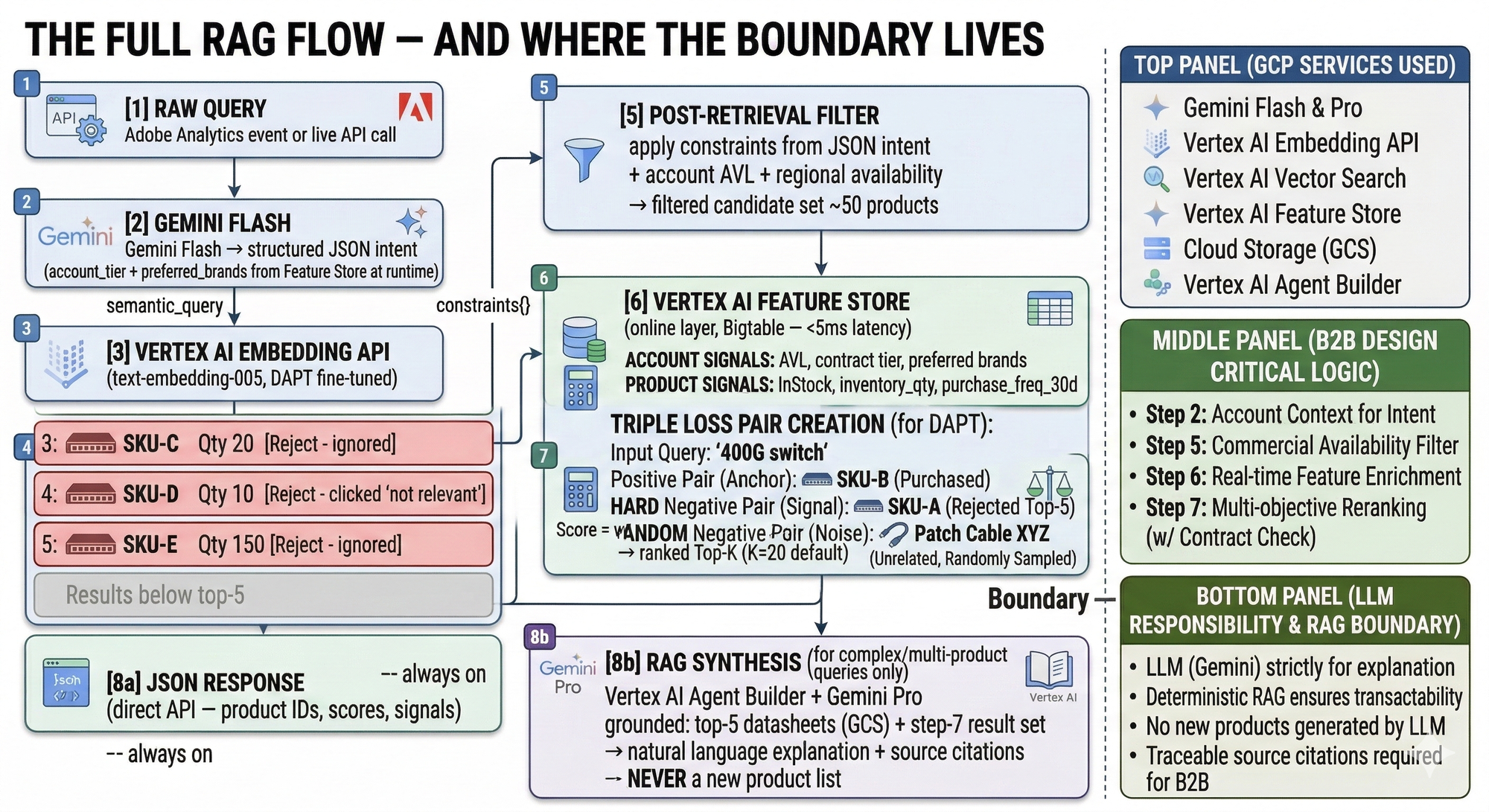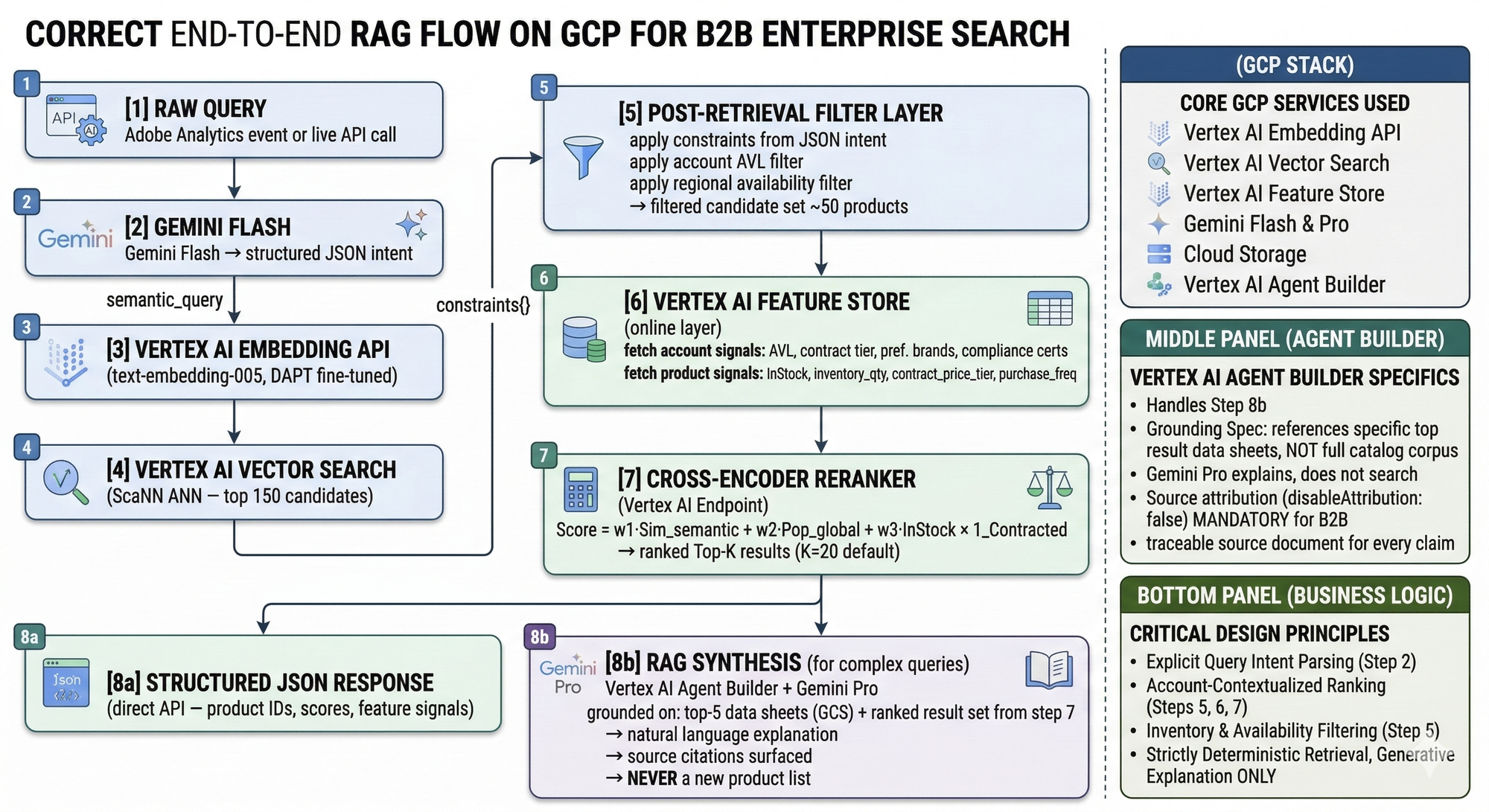 The semantic_query field feeds Vertex AI Embedding and then Vector Search. The constraints object becomes the post-retrieval filter. The account_filter block tells the reranker how to apply the contracted vendor boost. Full round-trip — Gemini Flash, embedding, ANN query — runs at about 180ms end-to-end when Vertex AI endpoints are in the same region as your serving infrastructure.