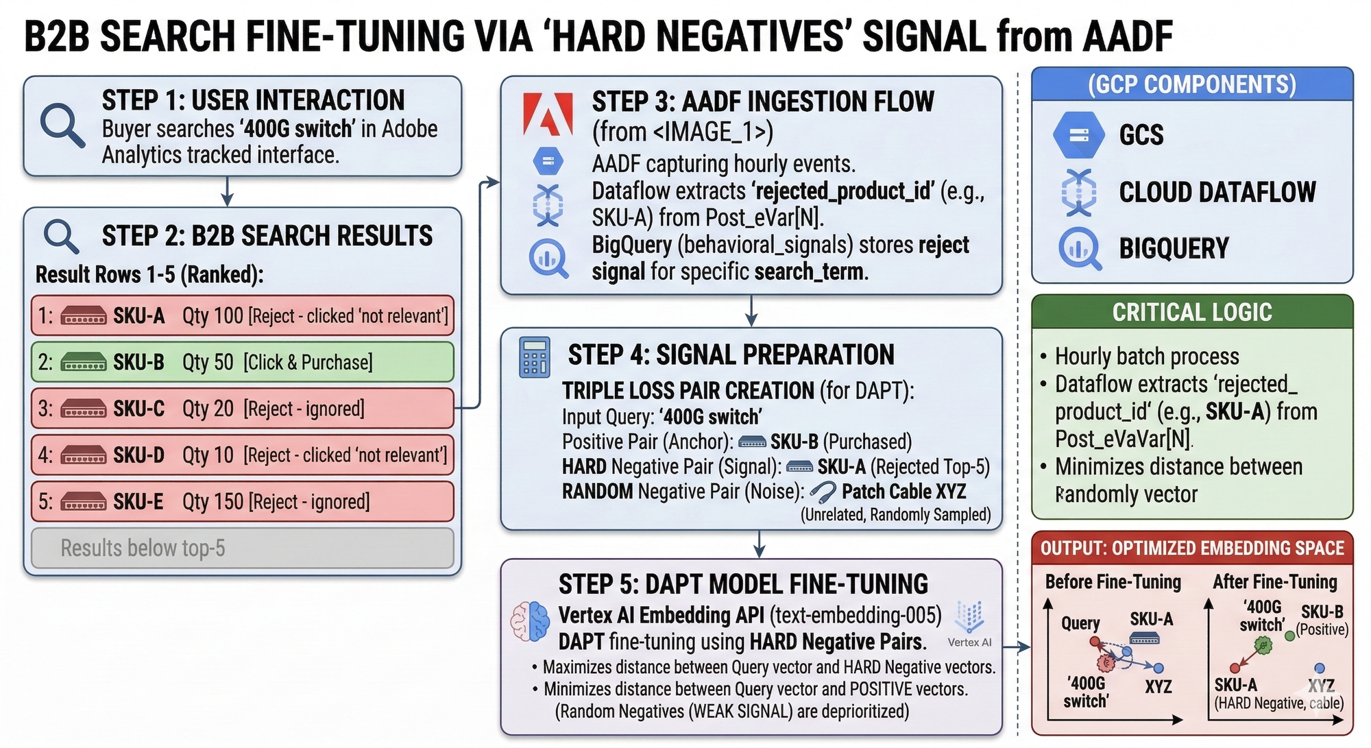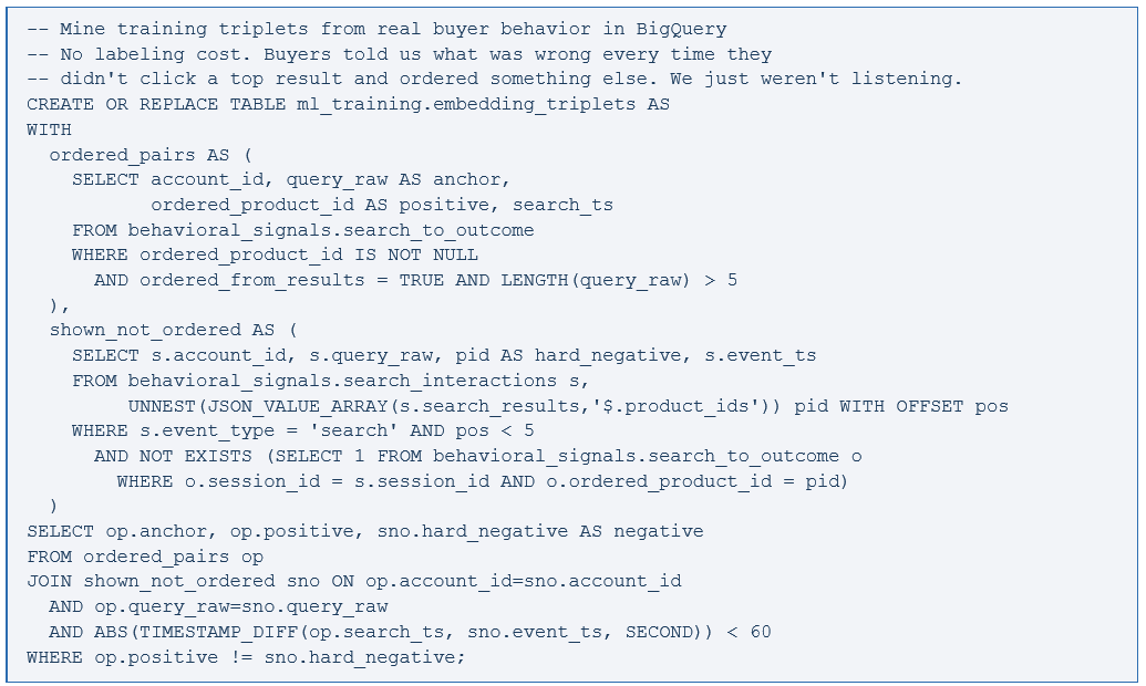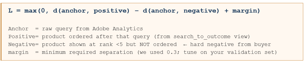 The hard negatives are everything. Random negatives produce weak signal. Adobe Analytics hands the hard negatives directly to you — products shown in top-5 positions that buyers rejected. That is the signal that makes fine-tuning effective.