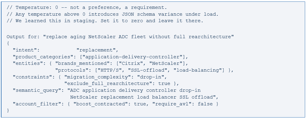 A buyer types: "need something to replace our aging NetScaler ADC fleet without a full rearchitecture." A tokenization-based parser drops rearchitecture as unknown vocabulary and returns Citrix ADC products sorted by popularity. The migration constraint — the whole point of the query — is completely gone. Gemini Flash, with account context injected at runtime from Feature Store, returns structured JSON the retrieval and ranking layers can actually execute against.