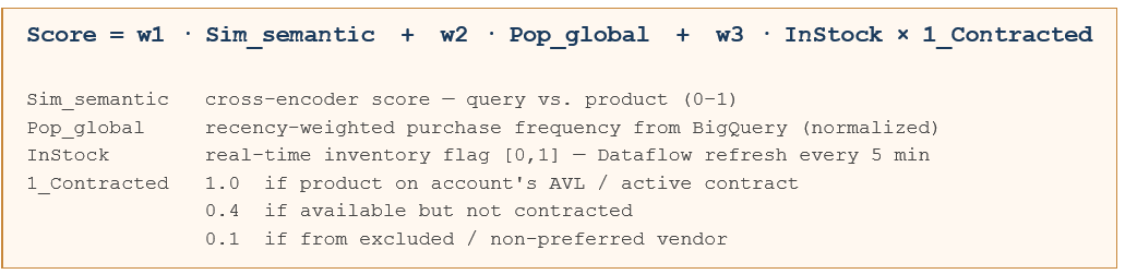 That 1_Contracted term is where most B2B search systems have nothing at all. It is also the single highest-leverage signal in the formula. We saw this in our account-tier cohort analysis: Gold-tier accounts had materially higher conversion when contracted products ranked in positions 1-3. When ranking ignored contract status, Gold accounts converted at barely above Silver rates. The contract signal was worth more than any amount of semantic tuning.