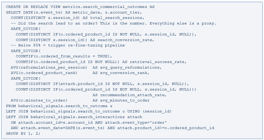 Four numbers I check every Monday morning: search conversion rate by account tier (Gold should be materially above Silver — if not, the 1_Contracted signal is degrading), retrieval success rate (below 85% kicks off the triplet mining pipeline), average query reformulations by category (rising in a specific category means the vocabulary gap is widening there), and recommendation attach rate versus baseline (the number that makes the business case for the procurement graph).