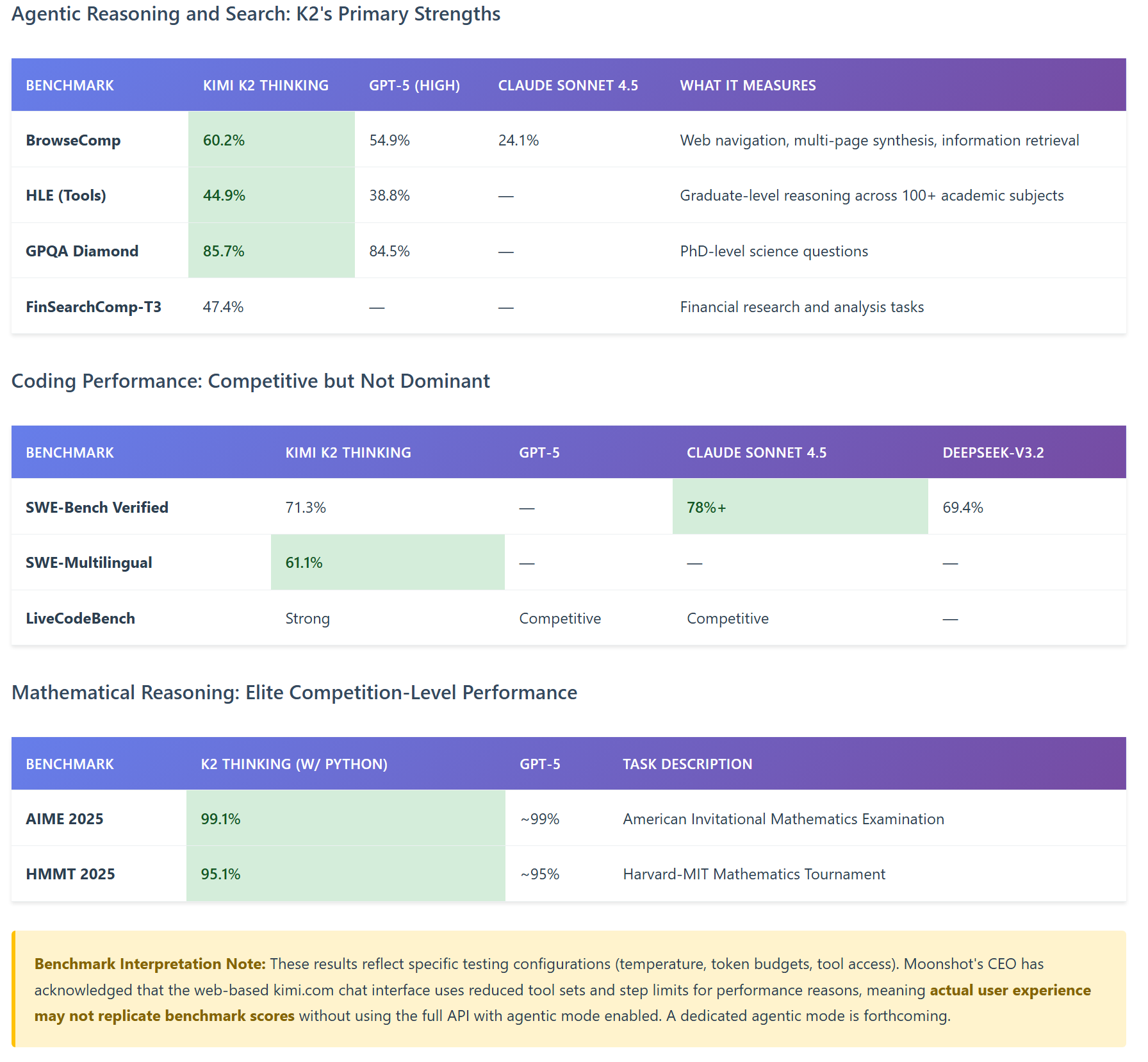 Moonshot AI's published benchmarks position K2 Thinking competitively with—and in some cases superior to—leading proprietary models. However, it's critical to interpret these results within appropriate context: no single model dominates across all task categories, and real-world performance depends heavily on specific use cases, deployment configurations, and integration quality.
