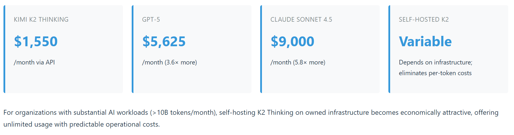 - Cost Optimization Without Quality Sacrifice: For workloads suitable to K2's strengths (research automation, data synthesis, long-form analysis), 80-90% cost reduction is achievable while maintaining frontier-class performance.